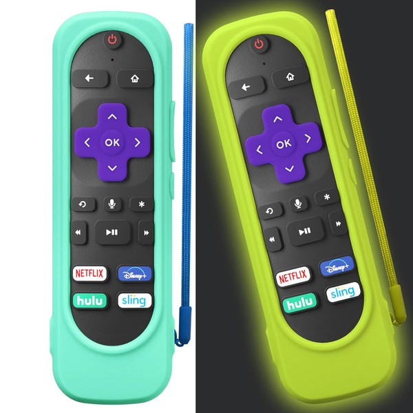 2 Pack Roku Smart TV Steam Stick Remote Controller Cover, Universal Skin Silicone Case for Most Roku Remote Models with Lanyard(Mint Green+Luminous Green)