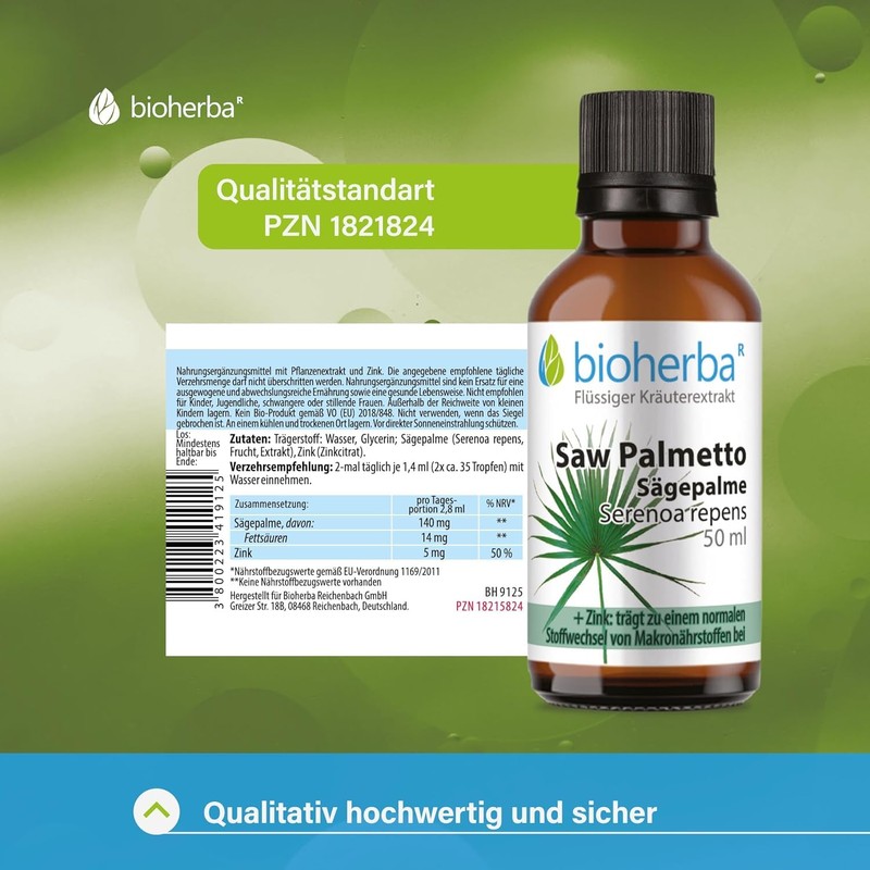 - Regulates hormone balance: Saw Palmetto drops can balance the hormonal balance and thus relieve the symptoms of hormonal imbalances in both men and women, including supporting healthy testosterone levels.
