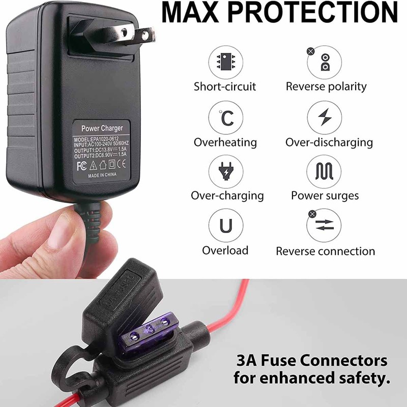 6V/12V Selectable Output-This device is 4 stages smart battery charger by microprocessor controlled with switch mode for 6V and 12V is selectable output. It is ideal for charging your CAR, MOTORCYCLE AND RIDE-ON TOY batteries, and great for agm gel vrla sla wet cell and all Lead Acid Batteries.