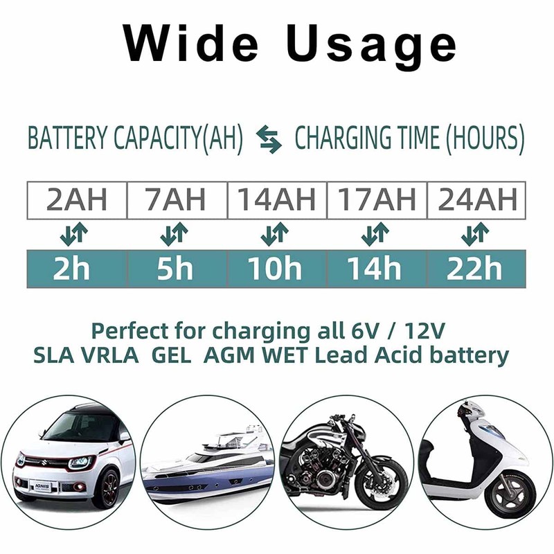 - 6V/12V Selectable Output-This device is 4 stages smart battery charger by microprocessor controlled with switch mode for 6V and 12V is selectable output. It is ideal for charging your CAR, MOTORCYCLE AND RIDE-ON TOY batteries, and great for agm gel vrla sla wet cell and all Lead Acid Batteries.