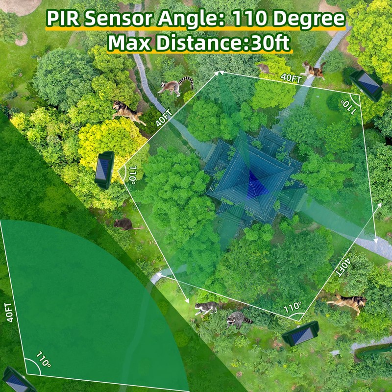 - 🦒24H A Day & Night Throughout: The sensitive motion sensor can detect distances of 110 degrees and 40 feet. Once the animal enters the detection range, the ultrasonic cat repellent outdoor can be triggered to start working, using the ultrasound language to friendly let the animals leave. We have specially added 1 large strobe light and 5 small flash lights to enhance the night repelling effect. There is no harm to humans or animals, and efficiency and safety have always been our pursuit.