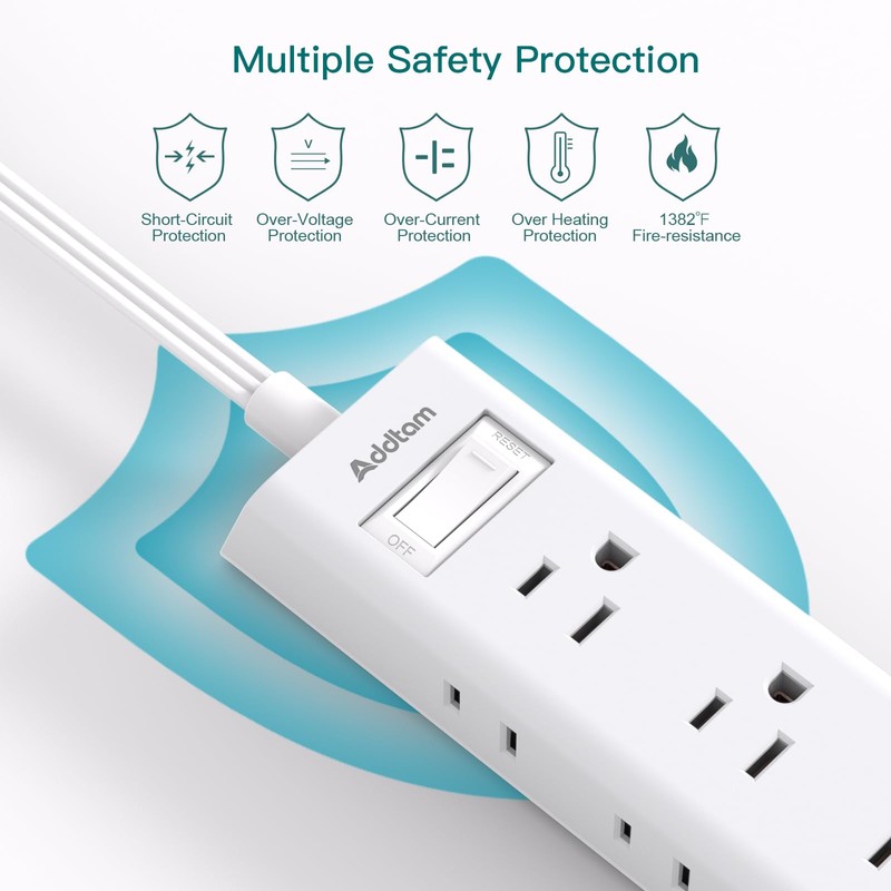 - 【Safeguard Your Devices & Appliances】- This Addtam surge protector has a 1050-Joule energy rating, overload protection, short-circuit protection, over-current protection, and so on. The on/ off switch can automatically shut off when the power exceeds rated value, to protect your expensive devices like computers, TV at home, office, college dorm, etc. ETL safety certified, with extension cord and other major components certified by UL.