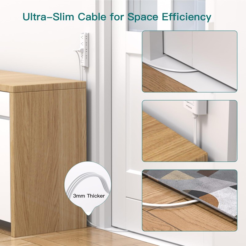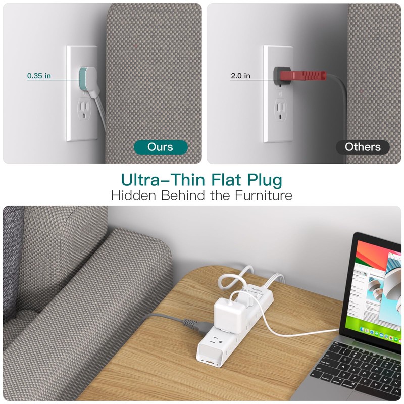 - 【Ultra Thin Flat Plug】- With only 0.35 inch ultra slim design, the flat plug power strip is much thinner than traditional plugs, which can close to the wall easily, and hide in the back of furniture, bed or refrigerator; 5ft extension cord is made of pure copper, which has better current carrying capacity (15A). The flexible power cord is not easy to deform, durable and more safety