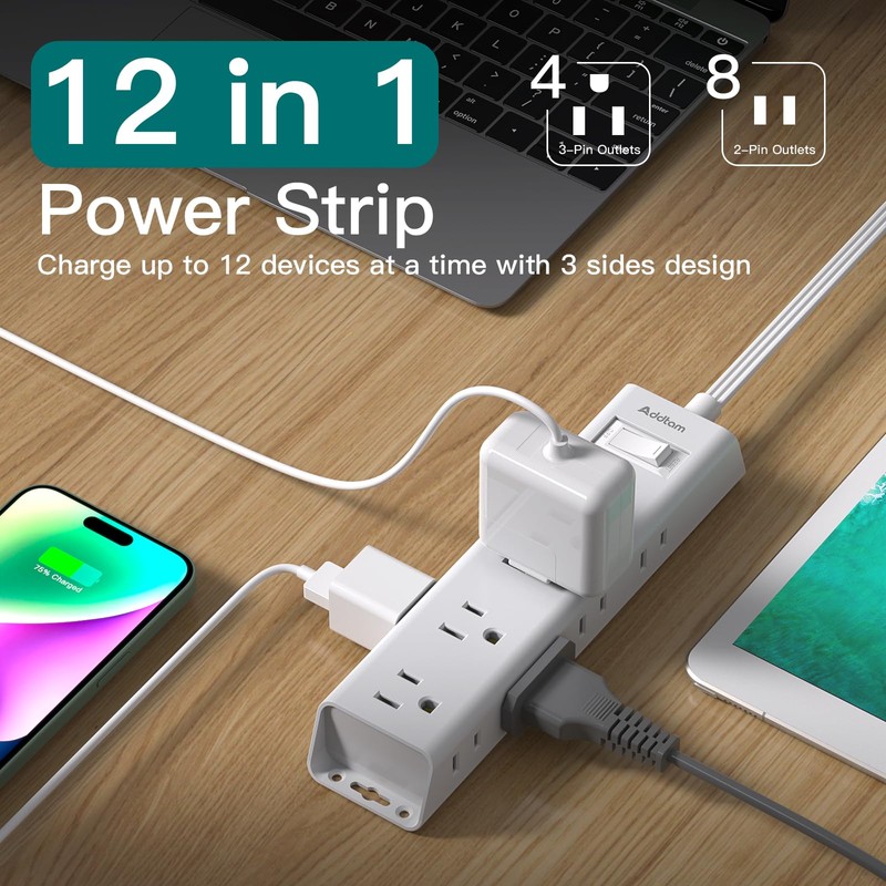 - 【Compact & Space-Saving】- Multi sided compact power strip with widely space fits large power adapters without blocking others, Extension cord with multiple outlets turns 1 sockets into 12 outlets, which could charge up to 12 devices at the same time. It would charge your cellphone, laptop, tablet, cameras without a variety of converters, save your space and make your desktop organized