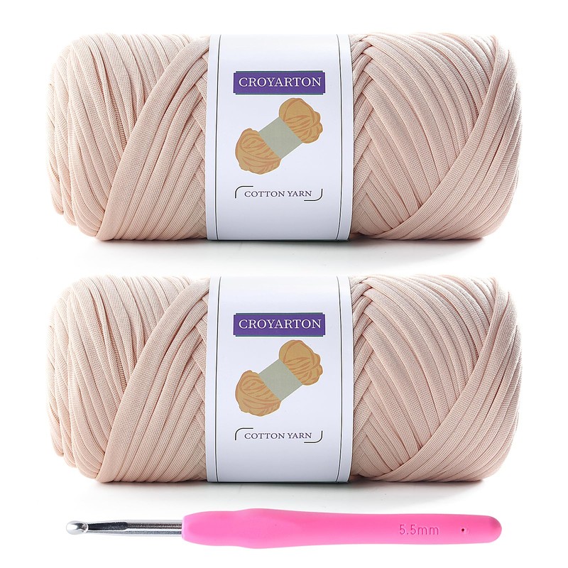 2 Pack T Shirt Yarn for Crocheting with 1 Crochet Hook, Elastic Tshirt Yarn for Crochet Bag/Baskets/Home Decor, Spaghetti Yarn Thick Knitting Yarn Total Length 130 Yds, Weight 14 Oz (Beige)