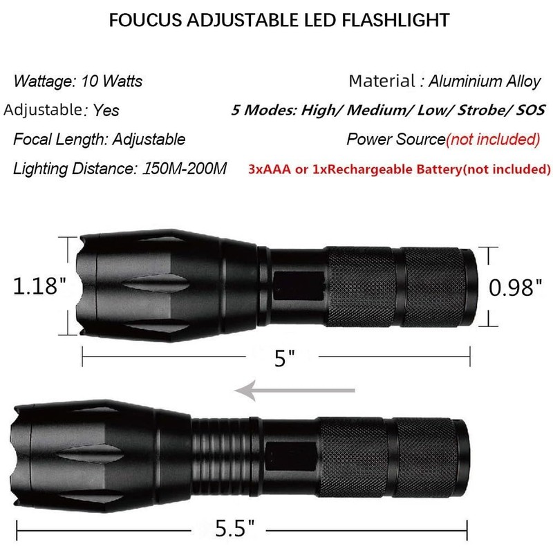 - Adjustable Focus - Adjustable focus for use in different situations (just rotate the flashlight head to adjust). The LED flashlight allows you to select focus between spot and flood beams.