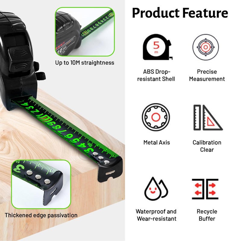 - Fluorescent Easy-Read Scales: 10M measuring tape featuring a luminous fluorescent coating, this measuring tape glows in low-light conditions, making it ideal for dimly lit workspaces or evening DIY projects. Read measurements effortlessly, even in challenging environments.