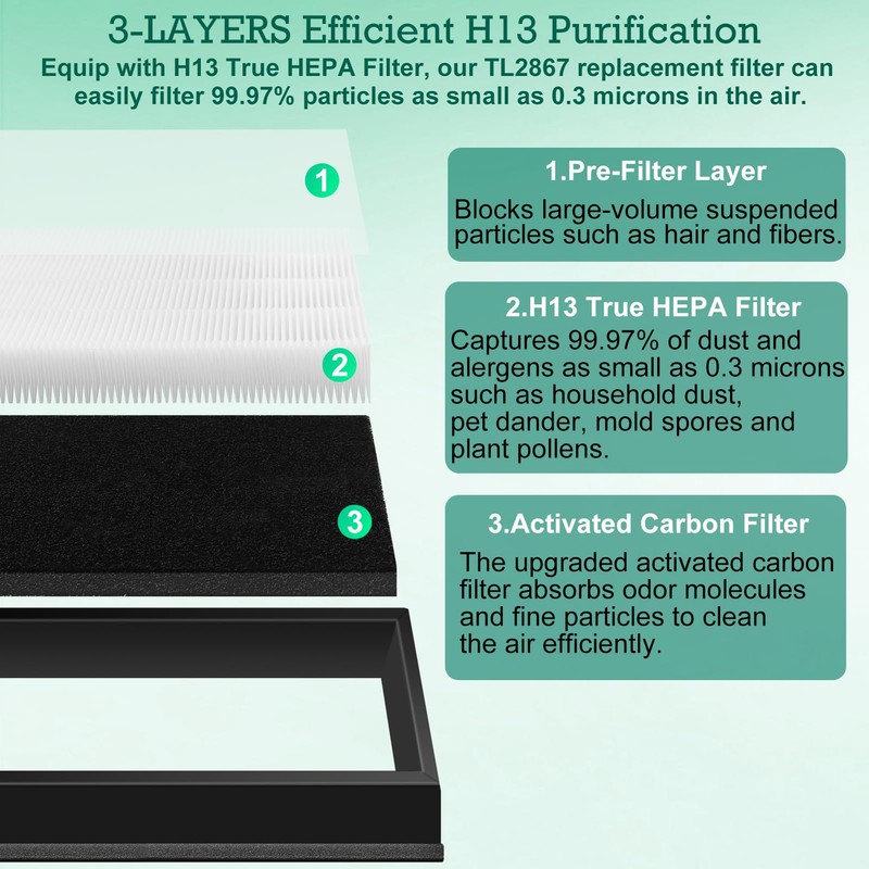 - 【Efficient H13 Filter】 -- Our replacement filter for TL2867 easily filters 99.97% of airborne particles as small as 0.3 microns, such as dust, smoke, pollen, hair, VOCs and odor for improved air quality. This system provides a new comfortable air environment for you and your family. Ideal for pet owners, smokers and city dwellers.