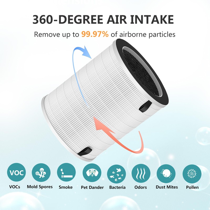 • Premium H13 MAX HEPA Filter for Afloia removes up to 99.97% of airborne particles down to 0.3 microns in size, that means almost any irritants like dust mites, mold spores, pollen and even most bacteria. For the vast majority of allergy suffers, a True HEPA filter will remove all offending allergens from your environment