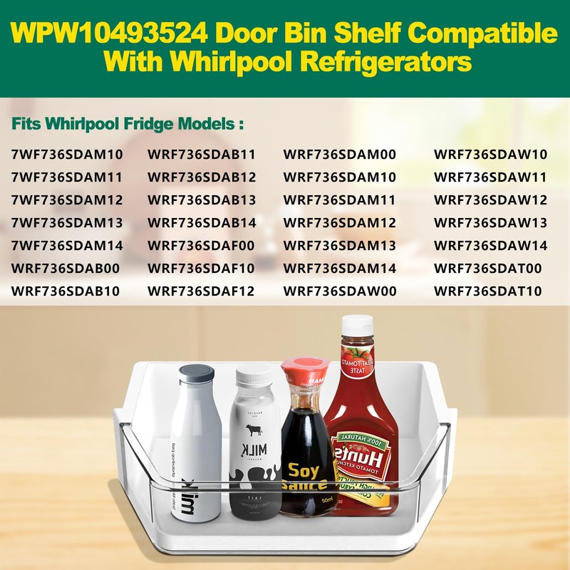 - 【Whirlpool Refrigerator Door Bin Fits Brand & Models】WPW10493524 Door Shelves Compatible with Whirlpool Refrigerators Parts. W10493524 fridge door shelf replacement fit models: 7WF736SDAM10, 7WF736SDAM11, 7WF736SDAM12, 7WF736SDAM13, 7WF736SDAM14 , WRF736SDAB00, WRF736SDAB10, WRF736SDAB11, WRF736SDAB12, WRF736SDAB13, WRF736SDAB14 , WRF736SDAF00, WRF736SDAF10, WRF736SDAF12 , WRF736SDAM00, WRF736SDAM10, WRF736SDAM11, WRF736SDAM12, WRF736SDAM13, WRF736SDAM14 , WRF736SDAW00, WRF736SDAW10, WRF736SDAW11, WRF736SDAW12, WRF736SDAW13, WRF736SDAW14, WRF736SDAT00, WRF736SDAT10, etc.