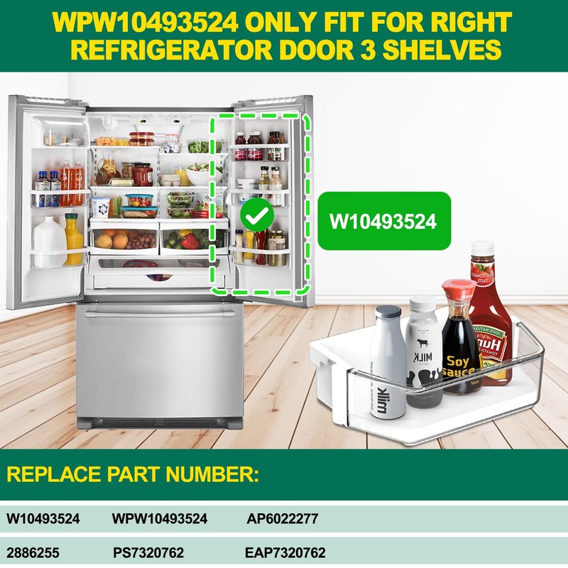 - 【Whirlpool Fridge Door Shelf Replacement】Whirlpool door shelf bin replacement Part Number:WPW10493524, W10493524, AP6022277, 2886255, PS7320762, EAP7320762, PS11755610, EAP11755610.whirlpool shelf replacement is well sealed to prevent liquid leakage and keep the refrigerator clean. Please confirm whether the model matches before purchase, And read our homepage and photos in detail.