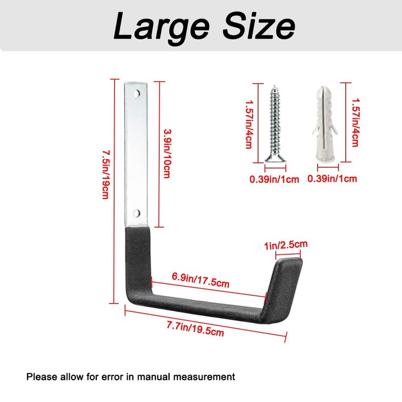 【Easy to Install】This garage wallhook is easy to install with no complicated skills. Just drill two holes on the wall with an electric drill, then use a hammer to tap the screws and expansion screws into the holes to fix them. The hooks are compatible with drywall, wall posts and various other wall types, ensuring quick and tidy installation.