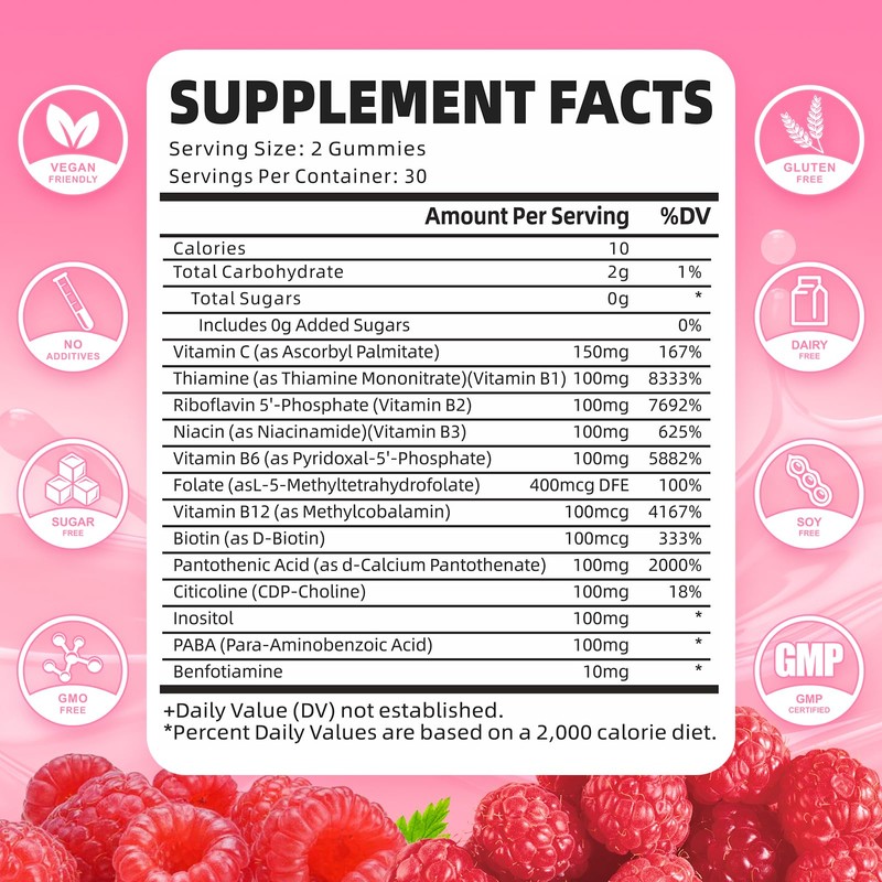 The Vitamin B Complex gummies contains essential B vitamins for the human body (Thiamin, Riboflavin, Niacin, B6, B12, Biotin and Pantothenic Acid), over 100% of the daily value of Folate as well as 150 mg of vitamin C, plus Choline, Inositol and PABA for healthy energy metabolism, immune support and more. Super B vitamin complex sustained release formula slowly releases over 6-8 hours to provide a steady balance of B Vitamins.
