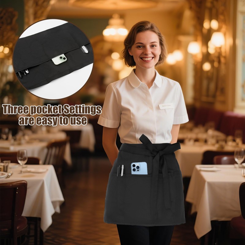 - 3 Practical Pockets: The waiter half aprons with 3 divided full deep pockets at the front, give plenty of storage, handy enough to keep recipe cards, phone, pen, paper, cooking gadgets, etc, keep your hands free