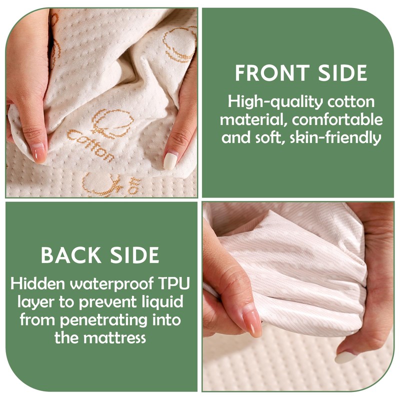 - HIGH QUALITY FABRIC: Our mattress protector features a premium top layer crafted from Cotton, offering a soft and gentle touch. This layer is combined with an efficient TPU waterproof barrier, ensuring both comfort and protection. guaranteeing skin-friendly performance. Designed with a breathable knitted jacquard structure, the surface delivers a smooth and contemporary texture. Although the finish may resemble synthetic materials, you can be assured that the top layer is cotton
