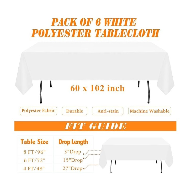 - 🌙Tablecloth for Rectangle Tables:The white rectangle tablecloth is 60x102 Inch, perfect for standard 6 ft table, providing 15 inch drop;Each package includes 2 pack of table clothes in same sizes to fit your needs perfectly