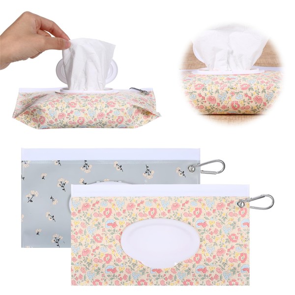 2 Pack Wipes Dispenser Refillable Wipe Holder Wipe Container with Hook Portable Wipes Pouch Reusable Travel Case for Travel Outdoor Outing Camping Hiking Shopping (Flower)