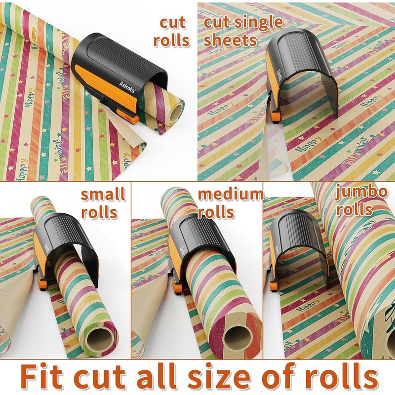- COMPATIBLE WITH ANY SIZE ROLL: Almost all types of gift paper can be cut well. Such as kraft paper, coated paper, glass paper, wallpaper. The cutting effect is unexpectedly good. Reminder: If the gift paper is soft and thin, you need to straighten the paper at the cut when cutting so that the blade can better cut a small opening for subsequent smooth cutting. After the wrapping paper roll cutting machine is upgraded, the gift wrapping tool is no longer limited by the thickness of the paper roll, whether it is large or small, there is no problem.