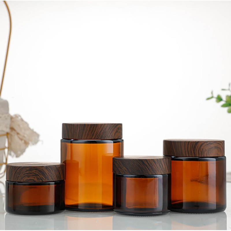 - Packgae includes: 2 Pcs 150 ml 5 oz empty amber glass cosmetic jars with wood grain lid and inner liners. Size: 6.2 x 8.2 cm / 2.44 x 3.22 inches, these jars are great for travel and home use