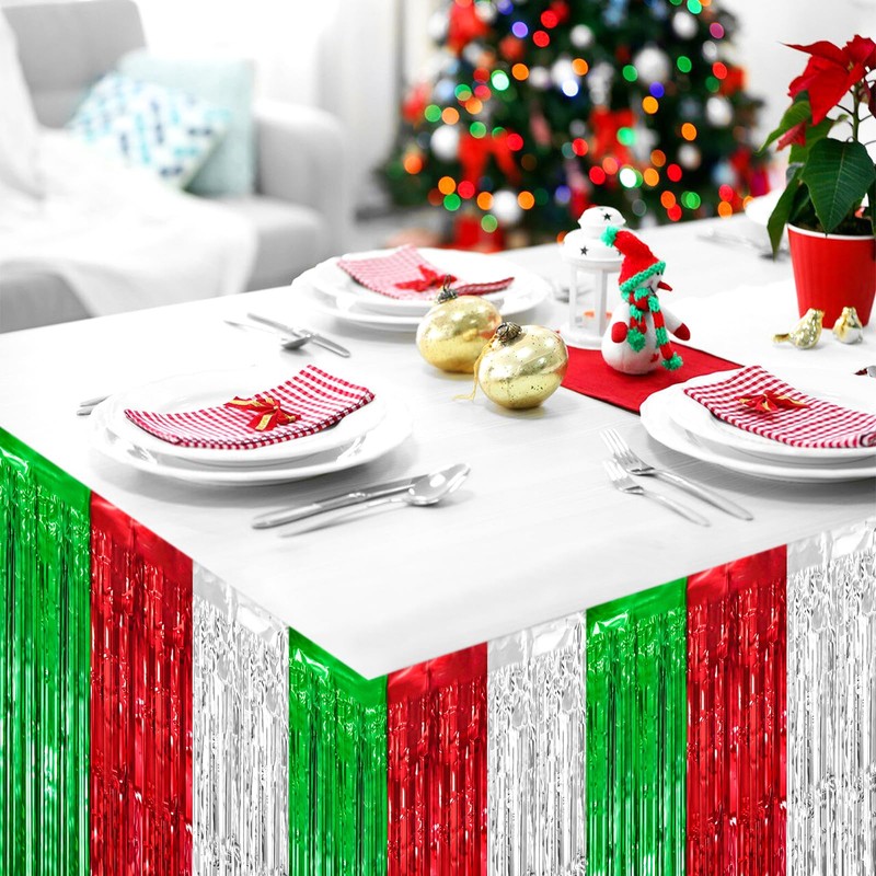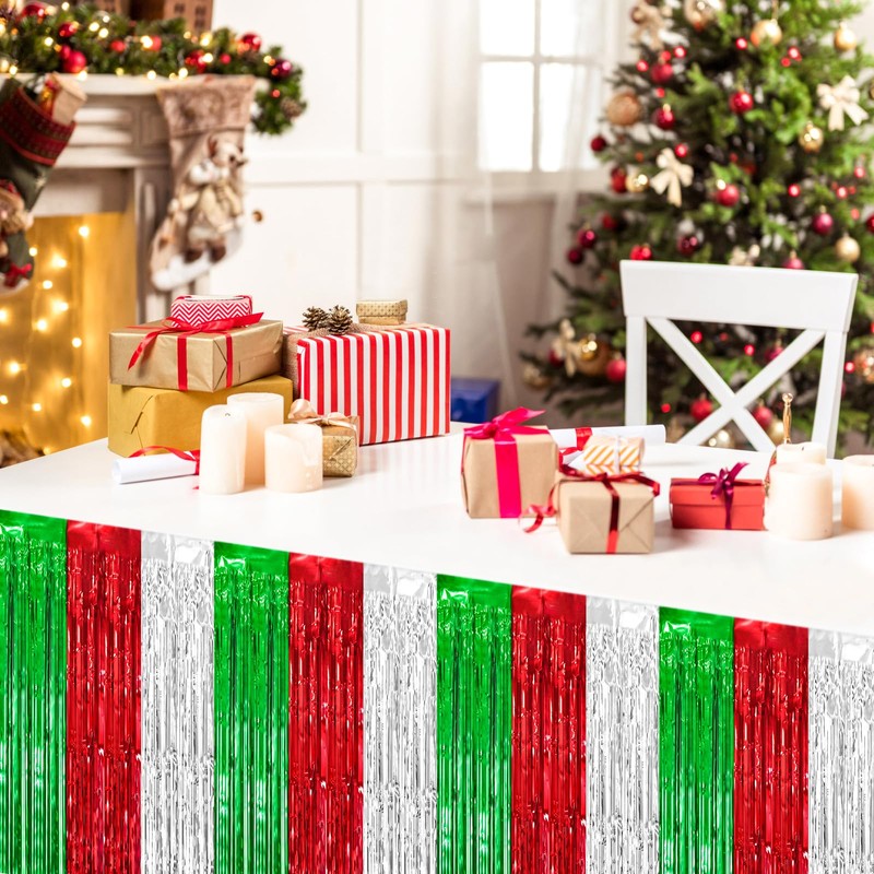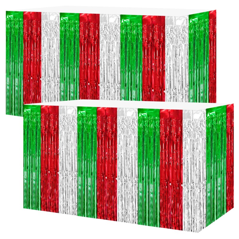 2 Packs Christmas Table Skirts Metallic Foil Fringe Table Curtain Tinsel Green Red Silver Table Skirt Streamer Backdrop for Christmas Birthday Party Decorations, 29.5x108 Inch