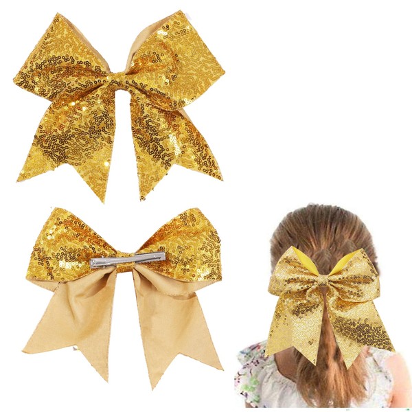 2 Packs Jumbo Gold Cheerleading Bow 8 Inch Large Cheer Hair Bows with Alligator Clips for Teen Girls Softball Outfit Uniform (Sequin Gold)