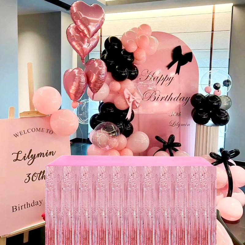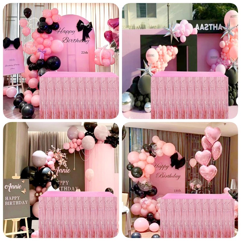 2 Packs Pink Metallic Foil Fringe Tinsel Table Skirts for Rectangle Tables 6ft 8ft Streamer Curtains Backdrop for Birthday Float Parade Wedding Graduation Black Pink Party Decoration -29x108 Inch
