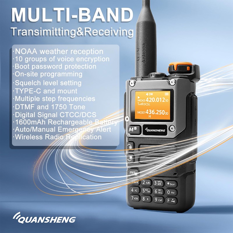 - Functions: Wide frequency range (144-148MHz 420-450MHz allows you to expand the frequency scope); Frequency copy/counter funcion; Larger display; Side mounted USB-C charging port; AM aircraft band; FM; DTMF; NOAA weather alarm etc