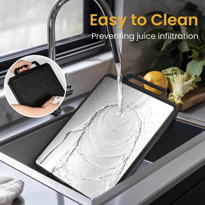 - Anti Slip Design: The anti-slip design of this cutting board for kitchen ensures stability with non-slip mats on all four sides. These high-grip, food-grade silicone mats create a secure suction on smooth countertops, preventing sliding during chopping or slicing, minimizing movement and noise.