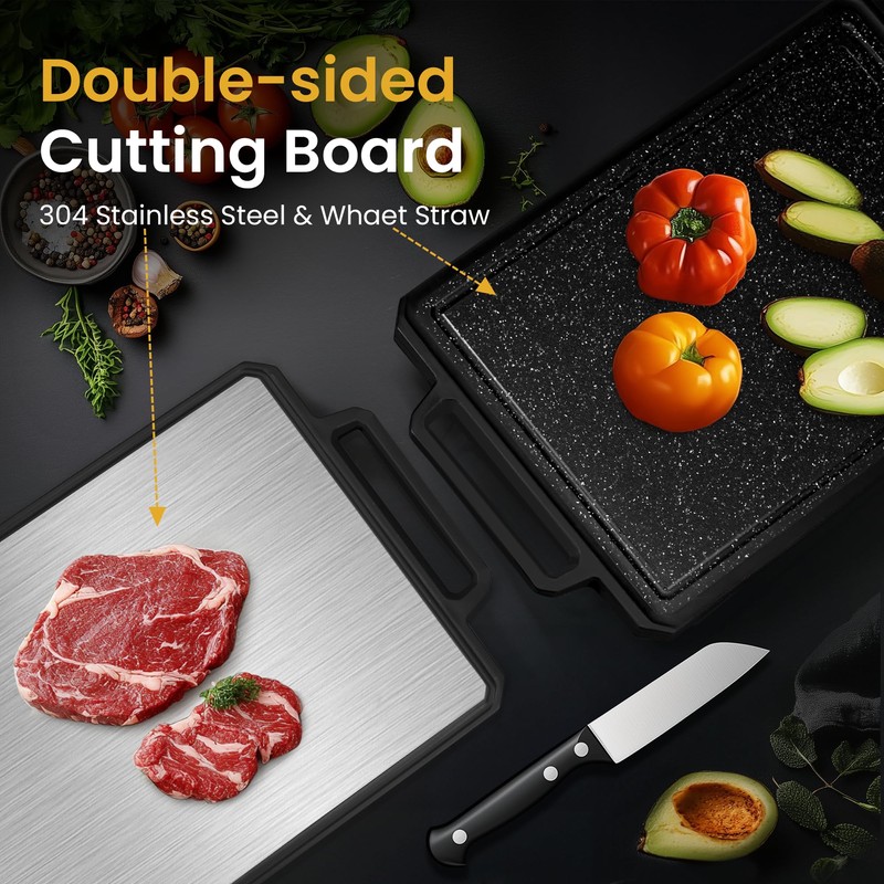 - Dual-Sided Cutting for Versatile Use: This cutting board features 304 stainless steel on one side and food-grade PP on the other, ensuring durability and safety. This cutting board non toxic is BPA-free, making it safe for direct food contact. Perfect for slicing meats or chopping fruits and vegetables, its sturdy construction resists wear and tear, providing a reliable, long-lasting solution for all your kitchen tasks.
