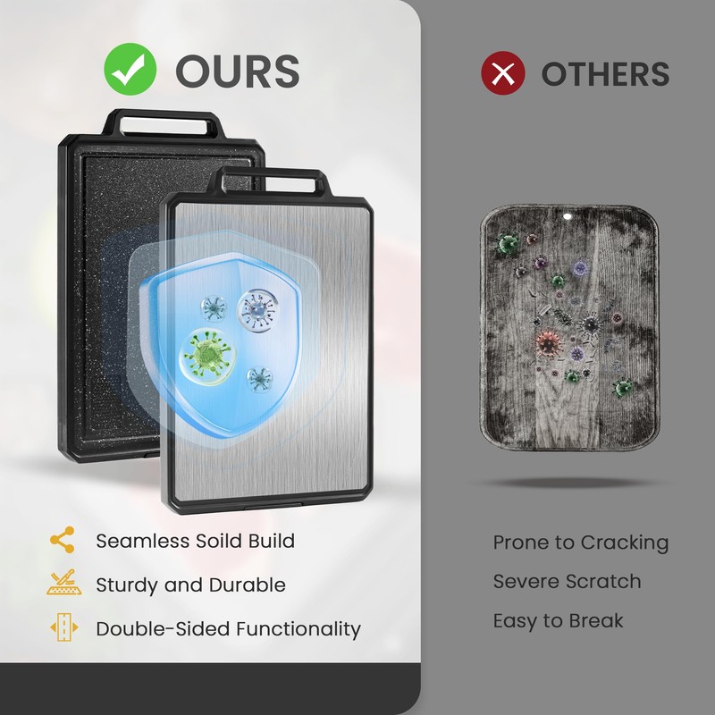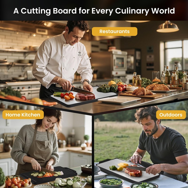- Easy to Clean & Store:Crafted with non-stick surfaces, the stainless steel cutting board simplifies cleanup—just rinse with water and wipe dry. Maintenance-free, stain-resistant, rust-proof, and odor-resistant. Perfect for home kitchens, outdoor picnics, or camping, this dual-sided cutting board combines functionality and portability, making it an essential tool for your kitchen and beyond.