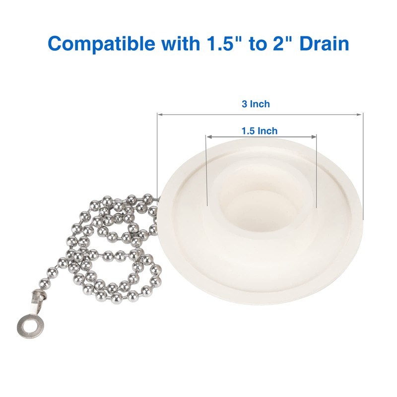Specifications: Item: bathtub stoppers Material: Rubber Color: White Size: Fit for 1.5" to 2" drain Item: beaded chain Material: stainless steel Length:15Inch (40cm)