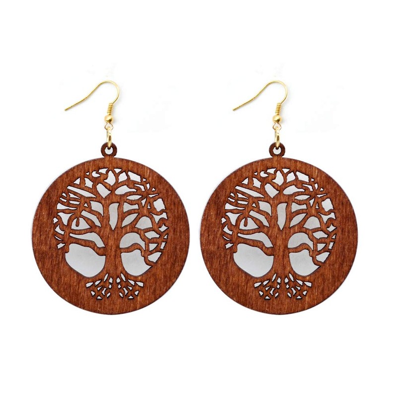 2 Pairs Bohemian Lightweight Wooden Tree of Life Dangle Earrings Handmade Teardrop Round Wood Earrings for Women-round