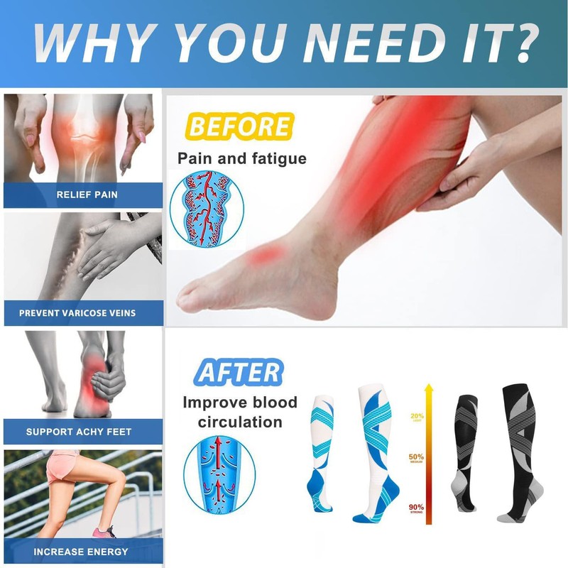 - PROVIDE INSTANT SUPPORT AND RECOVERY: Our knee high compression socks provide long-lasting support that relieves your ankle swelling, leg cramping and foot fatigue. Mens and womens compression socks effectively promote smooth flow of blood vessels from the distal end to the proximal end. Better blood circulation and oxygen flow means less pain, less swelling and more comfort.