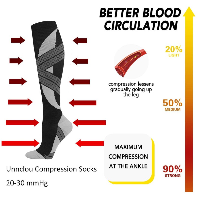 - GRADUATED COMPRESSION TECHNOLOGY: Feel your performance in everyday life improve with Unnclou compression socks! Designed to apply a 20-30 mmHg of compression that creates the highest support pressure at the ankle and gradually decreases along the legs. Promotes blood flow and improves circulation, helping you with relief and improvement in your calves, ankles and feet.