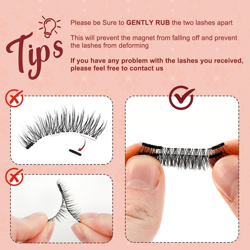 • Usage Tips:1. When taking out the magnetic eyelashes from the eyelash base, you should gently rub them to separate them into two pieces. 2. Put the magnetic eyelashes with red dots on the "upper" part and the eyelashes with white dots on the "lower" part. Make sure both parts are bent upwards. 3. When wearing the magnetic eyelashes, you need to align the root of the eyelashes with the applicator and then gently close the applicator.