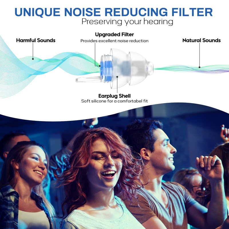 - Noise reduction earplugs: High-fidelity earplugs reduce harmful decibel values to protect your ears in noisy areas while preserving sound clarity and sharpness. Thanks to advanced filter technology, they have a noise reduction (SNR) of 23 decibels.