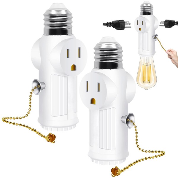 Light Socket Outlet Adapter,E26/E27 Light Bulb Outlet Socket Adapter,3 Prong Outlet Adapter with Cord Control Switch,Polarized Light Bulb Socket Splitter,White,2 Pack