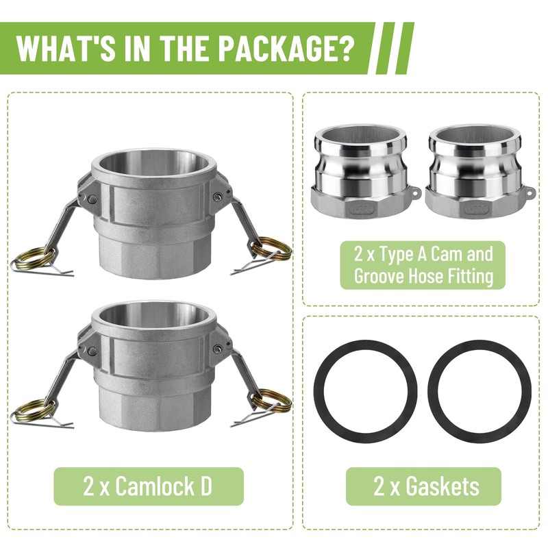 - Package Includes: 2 x Camlock B,2 x Type F Cam and Groove Hose Fitting,2 x Gaskets