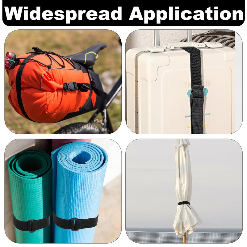 • ​​Multipurpose Outdoor Organiser: Adjustable straps beyond parasols, effortlessly bundle camping tents, bicycles, kayaks, or luggage with the versatile cinch system. The grippy elastic core conforms to irregular shapes like folded chairs or tool bundles, while the compact design (5cm x 100cm) slips into pockets or rucksacks. Use them to tidy hoses, secure tarpaulins, or organise sports gear – a practical solution for clutter-free garages, car boots, and storage sheds