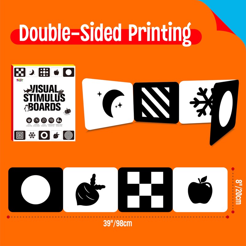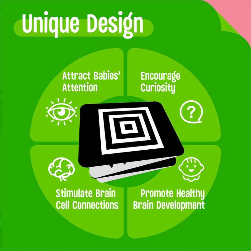 Double-side Design: Both two sides are printed different images with black or white background. Specifically designed high-contrast black and white patterns help stimulate visual development in newborns and young infants by capturing their gaze and strengthening focus skills.