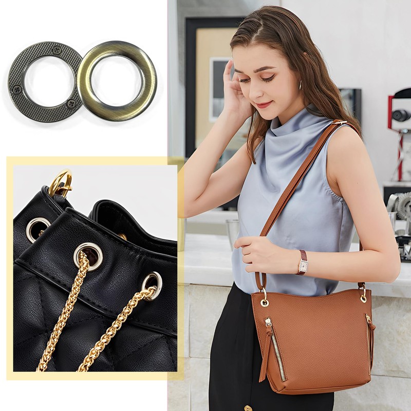 • Elegant Round Alloy Grommet Eyelets: These round alloy grommet eyelets add a stylish, professional look to leather bags. Their precise design allows easy threading of straps or cords, improving function and appearance