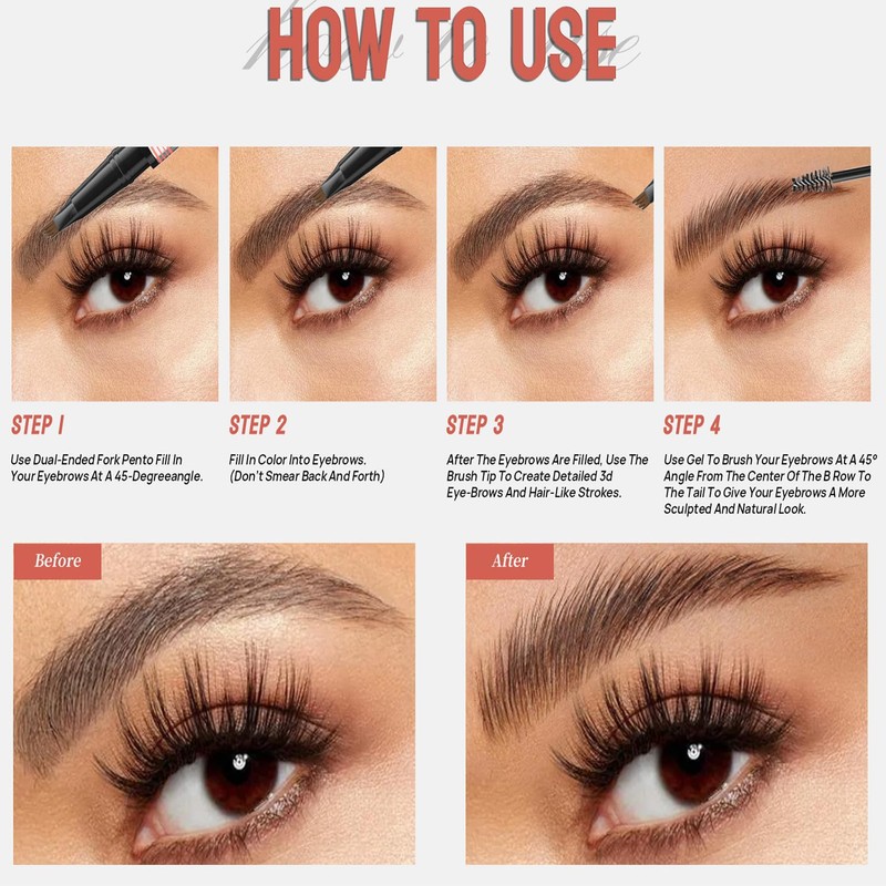 - [Dual-Ended Design] This 2-in-1 eyebrow pen combines a precision microblade eyebrow pencil with a waterproof eyebrow gel, offering effortless shaping, filling, and setting for natural-looking, full brows. The fork-tip design mimics hair-like strokes, while the gel locks brows in place all day without flaking.