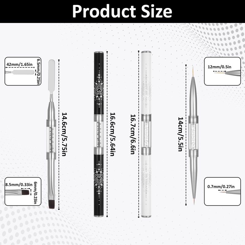 - You Will Get: Each order includes 2 pieces of dual-ended brushes (black and white) with varied tip styles. The set covers all essentials for nail art—from broad coverage to delicate detailing. Easy to clean and store, these brushes are a must-have for achieving salon-quality results at home or in a professional setting