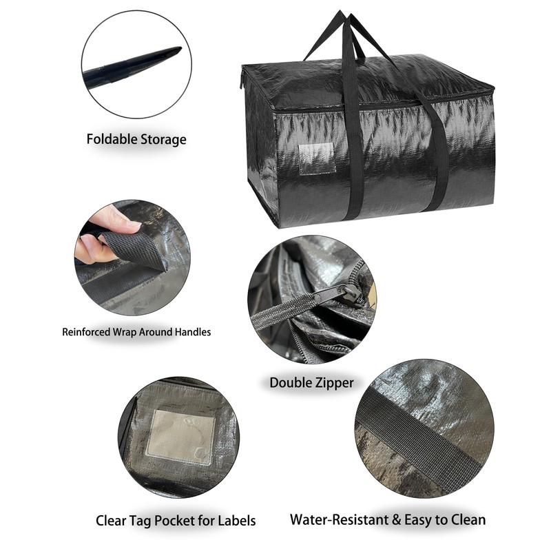 - 125L Large Capacity Moving Bags: These large storage bags are used to store and transport various items, such as clothes, toys, shoes, towels, supplies, pillows, bedding, sheets, blankets, laundry, Christmas decorations, or more.