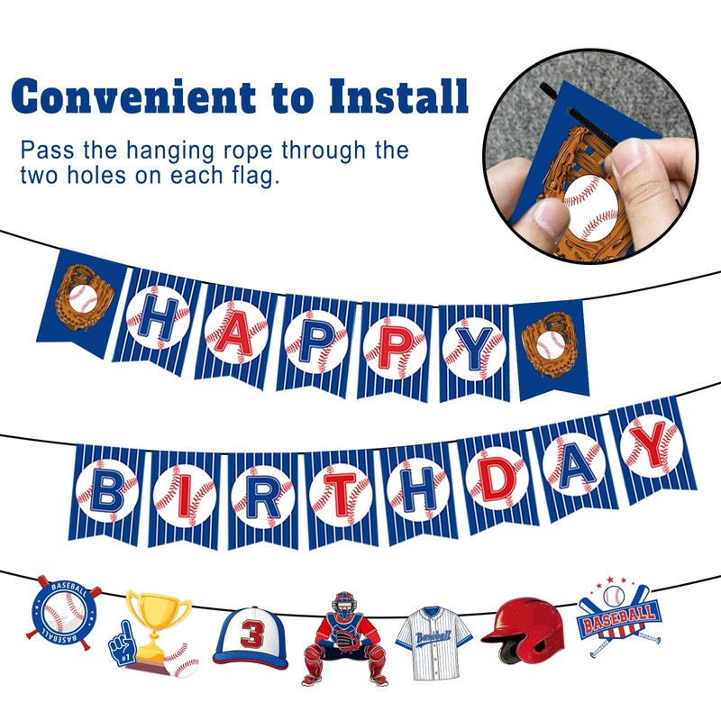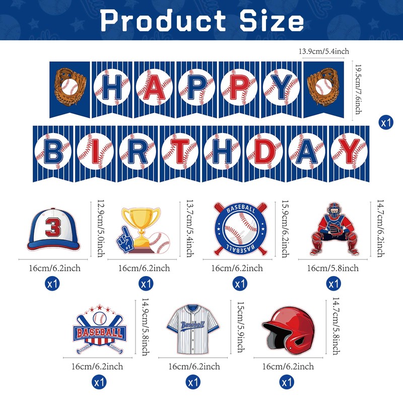 - Baseball Birthday Decorations Include: 1pcs baseball happy birthday banner, 1pcs baseball party banner,1 cotton thread. Baseball birthday banner size is 5.4*7.6 inches, baseball banner decorations size is 5.8*6.2 inches.