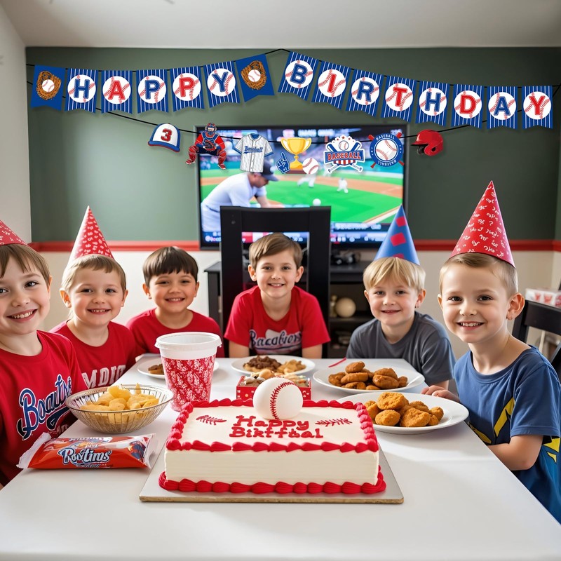 - Baseball Decorations For Party Design: The baseball party supplies have a lot of baseball pattern elements, using classic baseball colors such as blue, red, and white. Baseball themed party decorations will bring an interesting and unforgettable baseball birthday party.