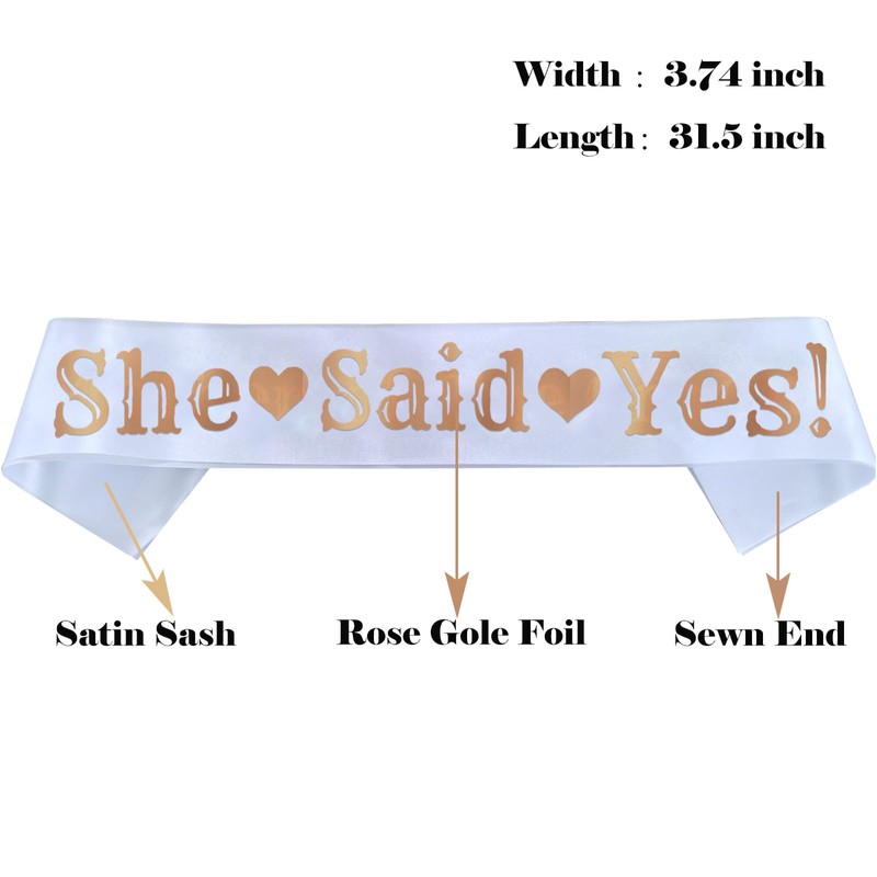 - Bachelorette Party Sashes: You will receive 1 pcs black groom to be sash with gold foil letters "He Asked" and 1pcs white bride to be sash with rose gold foil lettes "She Said Yes". You can upgrade your bridal shower. hen night, engagement party celebrations, it's your special day and we want you to look AMAZING!