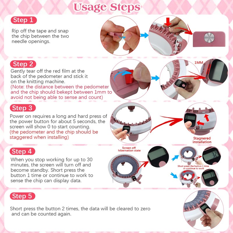 - Simple to Operate - Simply stick the counter to the knitting machine and the chip snaps onto the knitting machine gears (see instruction manual for details). Easy to install and use. Clear, easy-to-read display ensures you count easily and minimizes errors.