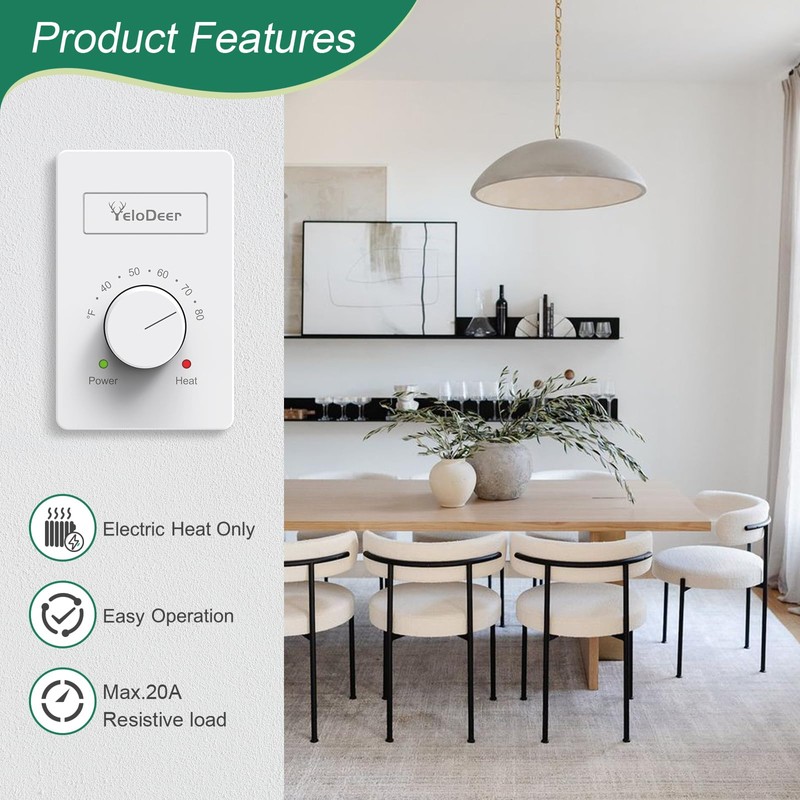 • User-Friendly Manual Control: Our non-programmable thermostat is designed for easy use, with a user-friendly interface that everyone can easily set and adjust the temperature. Indicator lights clearly show the connection point and whether heating is taking place