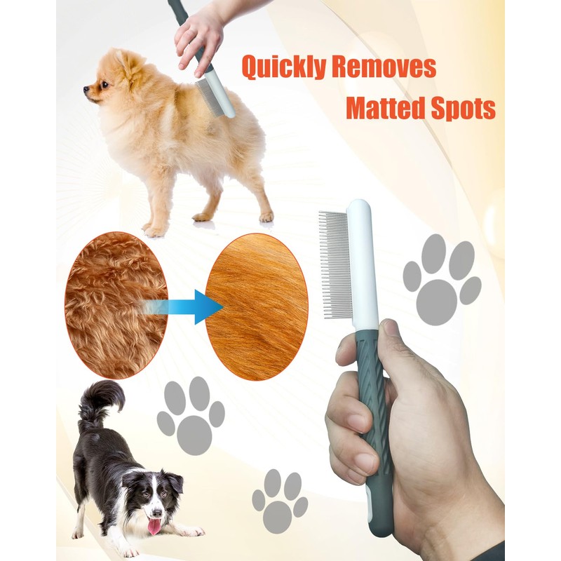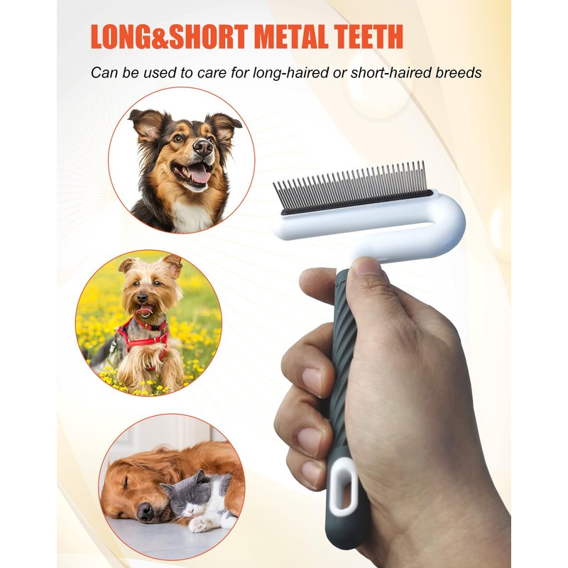 - LONG&SHORT STAINLESS STEEL TEETH:Both types of pet grooming comb are designed with long and short stainless steel teeth. Both long haired and short haired pets are suitable for this type of comb with long and short teeth. It can better penetrate into the bottom layer of hair and remove floating hair and dandruff inside. Can handle daily tasks such as opening hair and combing hair. It can also remove fleas and other debris from pets, keeping their skin clean and healthy at all times.